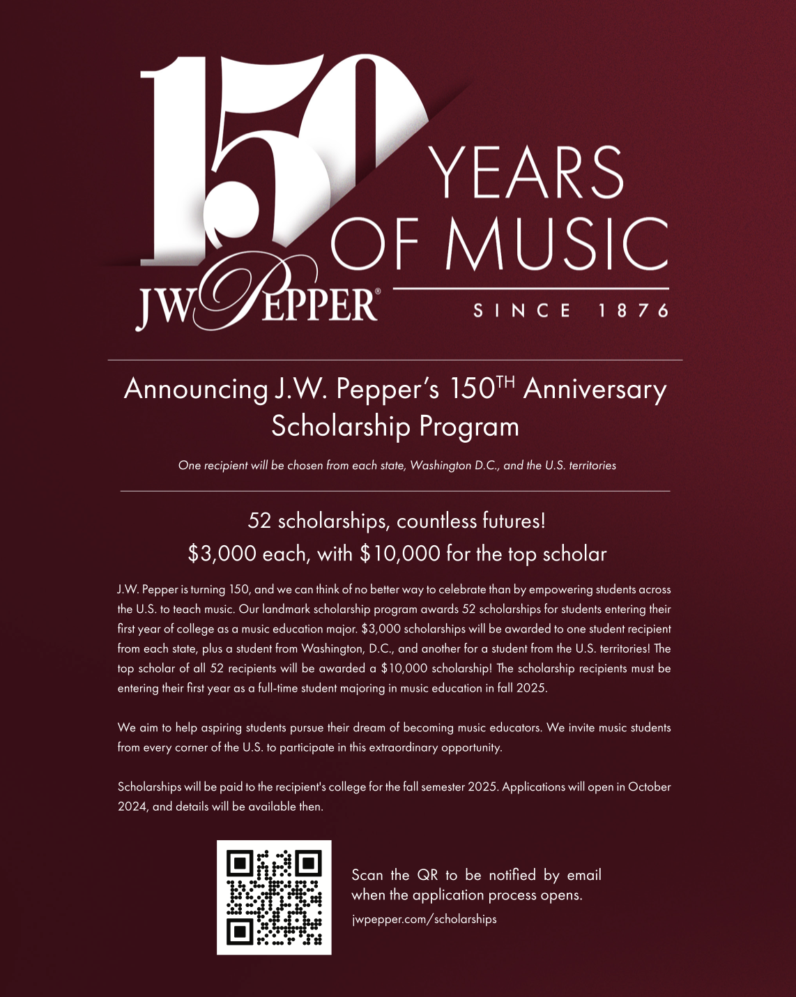 You’ll find more information at jwpepper.com/scholarships where teachers, parents, and students can find out more about the scholarship program.